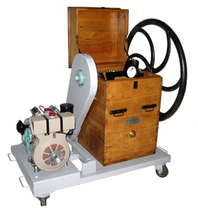 Pompe Denayrouze à volants, à 3 cylindres, à simple effet et à joints "Giffard". Construite par Ch. Petit entre 1895 et 1920. En France, c'est l'aboutissement de la pompe manuelle, simple et puissante. Elle permettait de travailler à grande profondeur. Protégée par sa solide caisse en chêne elle était de tous les chantiers. Elle restera la plus courante des pompes françaises ainsi que la plus exportée. Les établissements R. Piel continueront sa fabrication jusqu'à la fin des années 50.